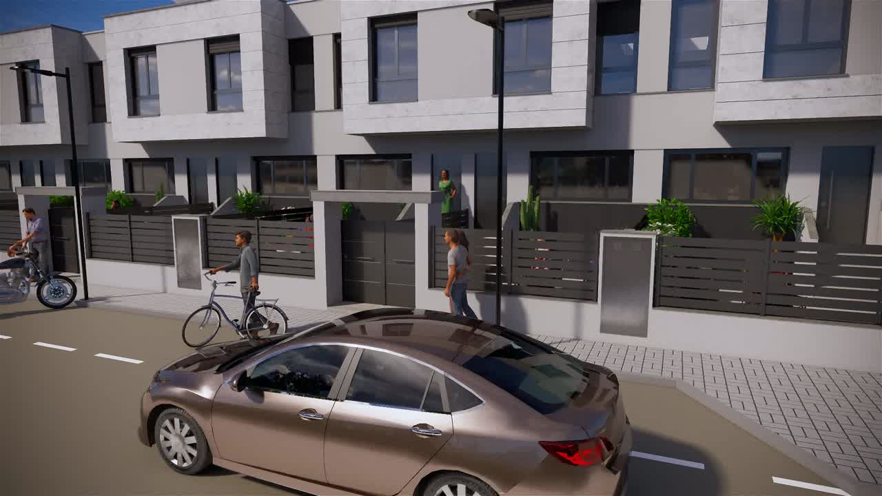 • Fachada revestida con monocapa liso y zocalo de cerámica. El cerramiento de la parcela en el frente de la fachada se ejecutará con un muro de fábrica, rematado con una valla de lamas fabricadas en aluminio o PVC de primera calidad.